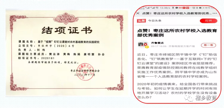 疫情影響,上半年學生無法到校上課,陰平學區(qū)率先在全區(qū)開展線上教學活動,學區(qū)教研室全面組織、協(xié)調(diào)全鎮(zhèn)小學統(tǒng)一開展網(wǎng)課活動,克服重重困難,以陰平中學小學部為龍頭,以點帶面帶領全鎮(zhèn)中小學進行網(wǎng)上授課,取得可喜成績。原市委書記李峰和市委副書記、嶧城區(qū)委書記于玉親臨陰平困難學生家庭,調(diào)研空中課堂開展情況;棗莊市電視臺《今晚新看點》欄目報道陰平中學網(wǎng)課助學成果。陰平鎮(zhèn)中學《“釘住信息化、釘助教育夢”——基于互聯(lián)網(wǎng)+下的釘釘云課堂》被教育部評定為疫情防控期間“停課不停學”優(yōu)秀案例,這是山東省唯一一個農(nóng)村學校的案例,也是全國唯一一個“釘釘云課堂”案例。