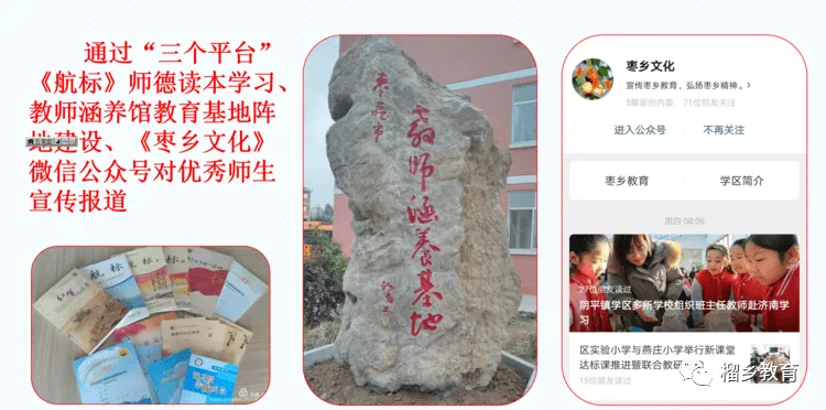陰平學區(qū)通過開展黨員干部“六個一”活動帶動全體干部教師加強作風建設和政治思想學習,通過“三個平臺”《航標》師德讀本學習、教師涵養(yǎng)館教育基地陣地建設、《棗鄉(xiāng)文化》微信公眾號對優(yōu)秀師生進行宣傳報道,引領教師在思想上進一步得到提升。