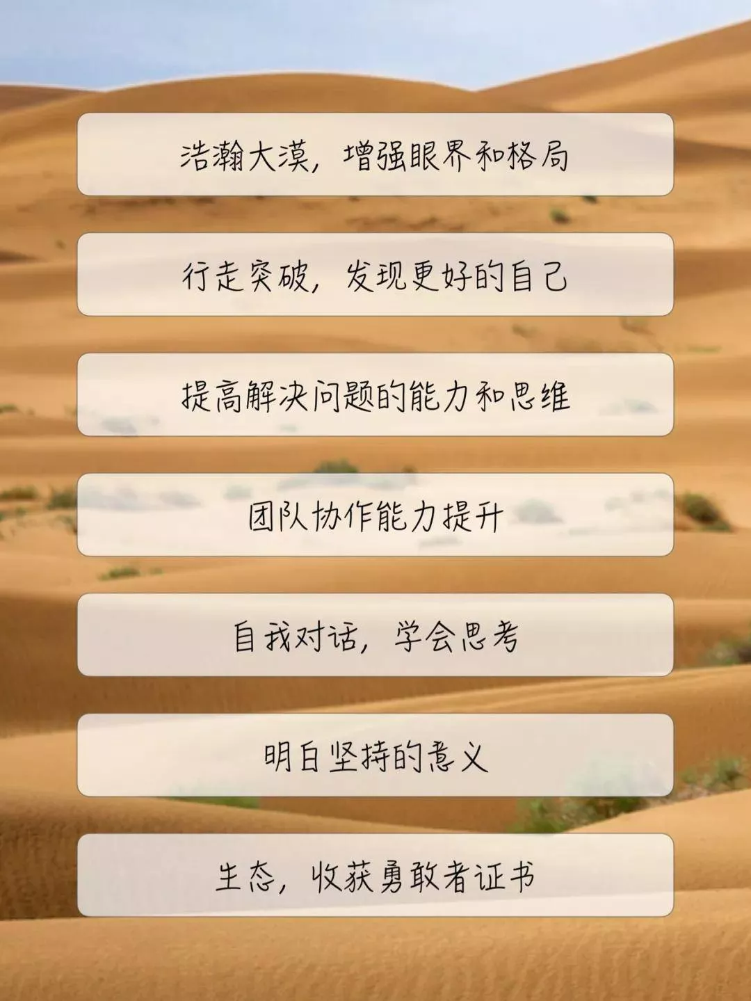 “不管前方的路有多苦,只要走的方向正確,不管多么崎嶇不平,都比站在原地更接近幸福?!薄獙m崎駿少年不止步“每個(gè)孩子的潛力都是無窮的”通過合理的沙漠徒步去激發(fā)孩子的勇氣和毅力明白堅(jiān)持的意義無垠的沙漠就是你的戰(zhàn)場(chǎng)點(diǎn)點(diǎn)的綠洲就是你的希望成長(zhǎng),本就是不斷磨練的過程沙漠毅行每個(gè)孩子都在熱愛的路上永不止步探索來到沙漠,你一定有無數(shù)的問題帶