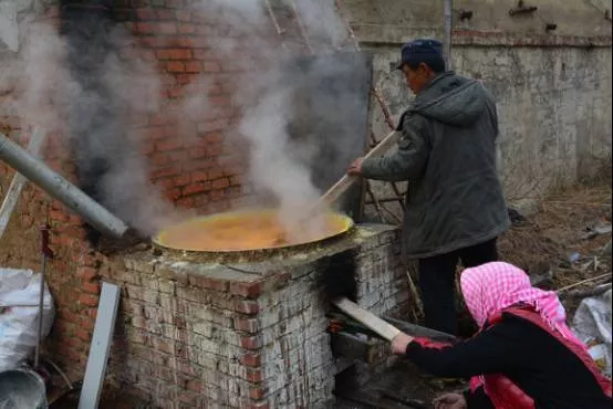 三月下旬。桃樹長葉前,噴灑農場自制的石硫合劑,防治果樹表皮的蟲卵。石硫合劑是一種傳統(tǒng)的礦物源制劑。
