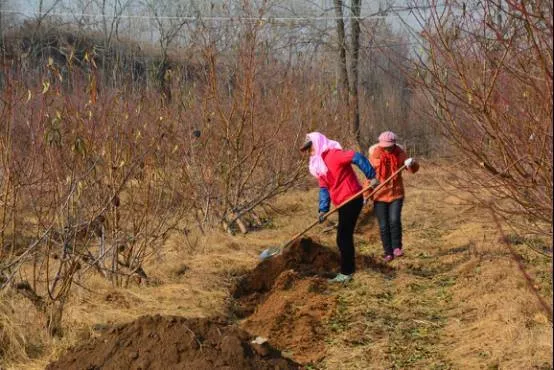 園區(qū)工作人員在去年11月中旬為桃樹等果樹挖溝施撒發(fā)酵好的內蒙羊糞