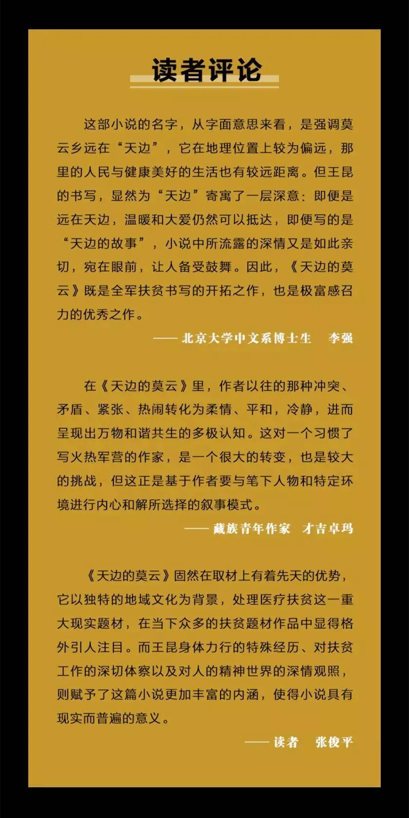 《天邊的莫云》是青年軍旅作家王昆繼《六號(hào)哨位》之后的長(zhǎng)篇新作,原發(fā)《中國(guó)作家》2020年第11期。該小說(shuō)聚焦一個(gè)名為莫云鄉(xiāng)的牧區(qū),詳細(xì)記錄了在黨的領(lǐng)導(dǎo)下,解放軍醫(yī)護(hù)工作者對(duì)藏區(qū)居民的全力幫助,進(jìn)而全方位展現(xiàn)了精準(zhǔn)扶貧背景下軍民之間的魚(yú)水深情。