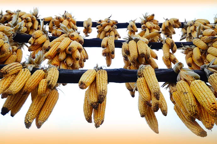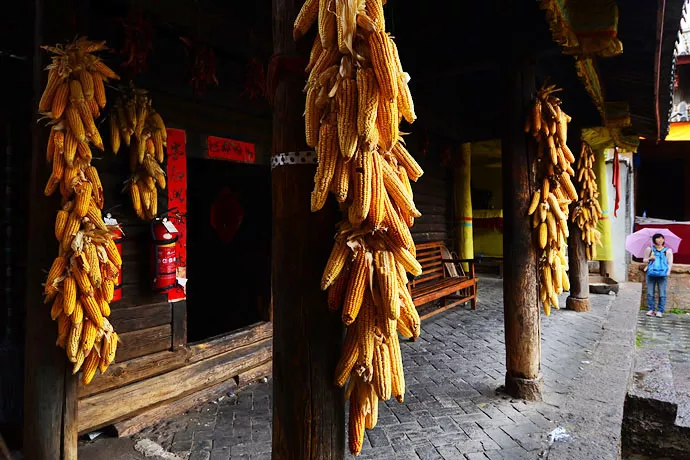 玉米掛滿屋檐房柱。