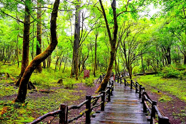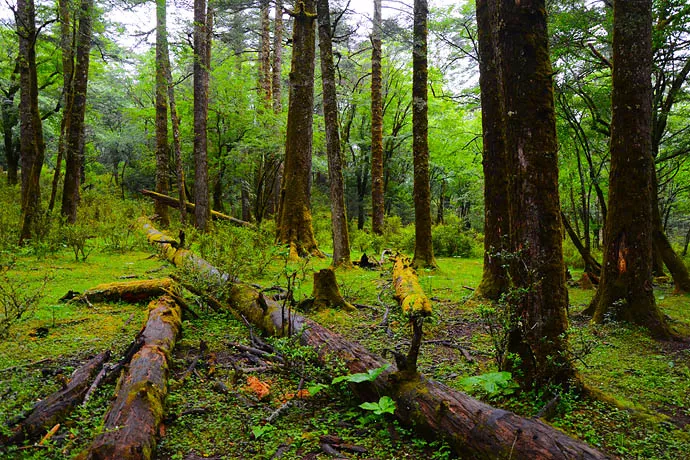 云杉坪景色以原始森林風(fēng)貌為主,自云杉坪索道上站開始沿棧道前行,原始樹木參天蔽日,空山鳥語(yǔ),曲徑通幽。棧道盡頭就是云杉坪,深藏在雪峰之下,云杉環(huán)抱的高山草甸,這里青草如茵,草叢間散布著如星朵般的鮮花,融雪化成的泉水悄悄穿游。