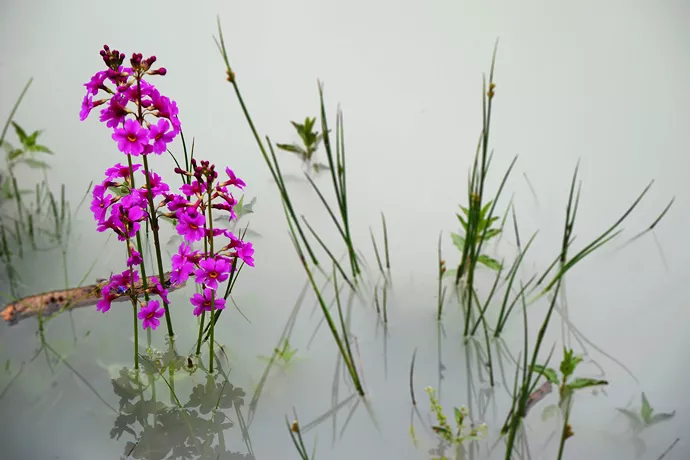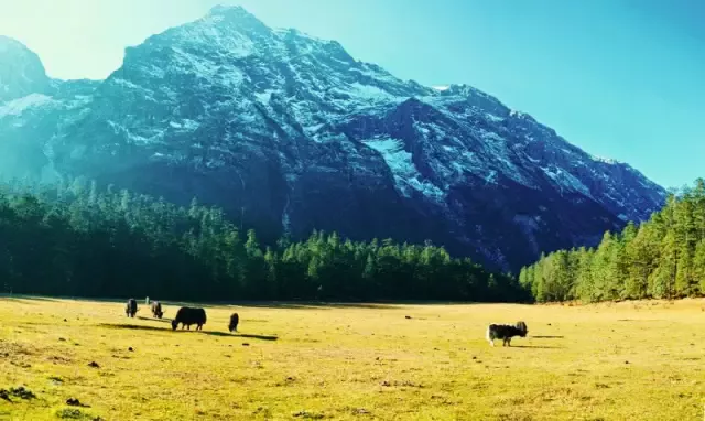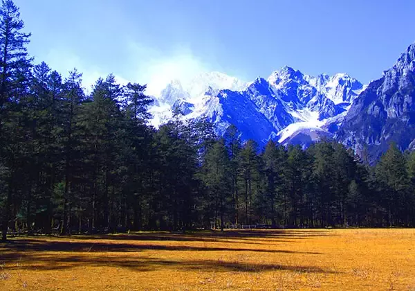 云杉坪由近至遠(yuǎn),層層推移,立體景觀,多姿多彩。首先是腳下的草坪,平緩而起伏,連綿千米。春夏是碧草連天,山花浪漫,秋天是一片泛黃,冬天則成了一個(gè)銀色的世界,四季顏色變化。其次是草甸邊緣的森林,在雪山與草甸之間形成一個(gè)天然屏障,在視線中,它色感沉厚,如默默守望這片草甸的牧人。最后是玉龍雪山,它高聳入云、蕩氣吐霧,巨大的身影仿佛從空中俯視著這里,像嚴(yán)父慈母般將草甸擁入它的懷抱。
