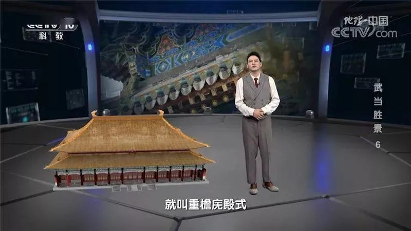 主持人 勝春:修復(fù)工程的建筑專家剛才說了一個詞,單檐硬山靠。這個詞是古建筑領(lǐng)域的一個專業(yè)名詞,用來描述古屋房頂?shù)男沃?。在中國的古建筑?dāng)中,不同規(guī)格不同等級的房屋,它的房頂形制是不一樣的。咱們來簡單介紹幾種。這是故宮太和殿,它的屋頂形制,叫廡殿式,同時,它又有兩層屋檐,所以這種屋頂?shù)娜Q就叫重檐廡殿式,這是中國古建筑最高規(guī)格的形制,只有皇家,和受皇封的宮觀,才能用這種屋頂,比如武當(dāng)山金殿,也是這種形制。