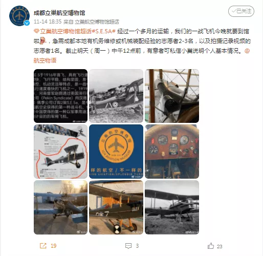 稱“經(jīng)過(guò)一個(gè)多月的運(yùn)輸,我們的一戰(zhàn)飛機(jī)今晚就要到館啦。急需成都本地有機(jī)務(wù)維修或機(jī)械裝配經(jīng)驗(yàn)的志愿者2-3名,以及拍攝記錄視頻的志愿者1名。截止明天(周一)中午12點(diǎn)前,有意者可私信小巢說(shuō)明個(gè)人基本情況?!?/p>
