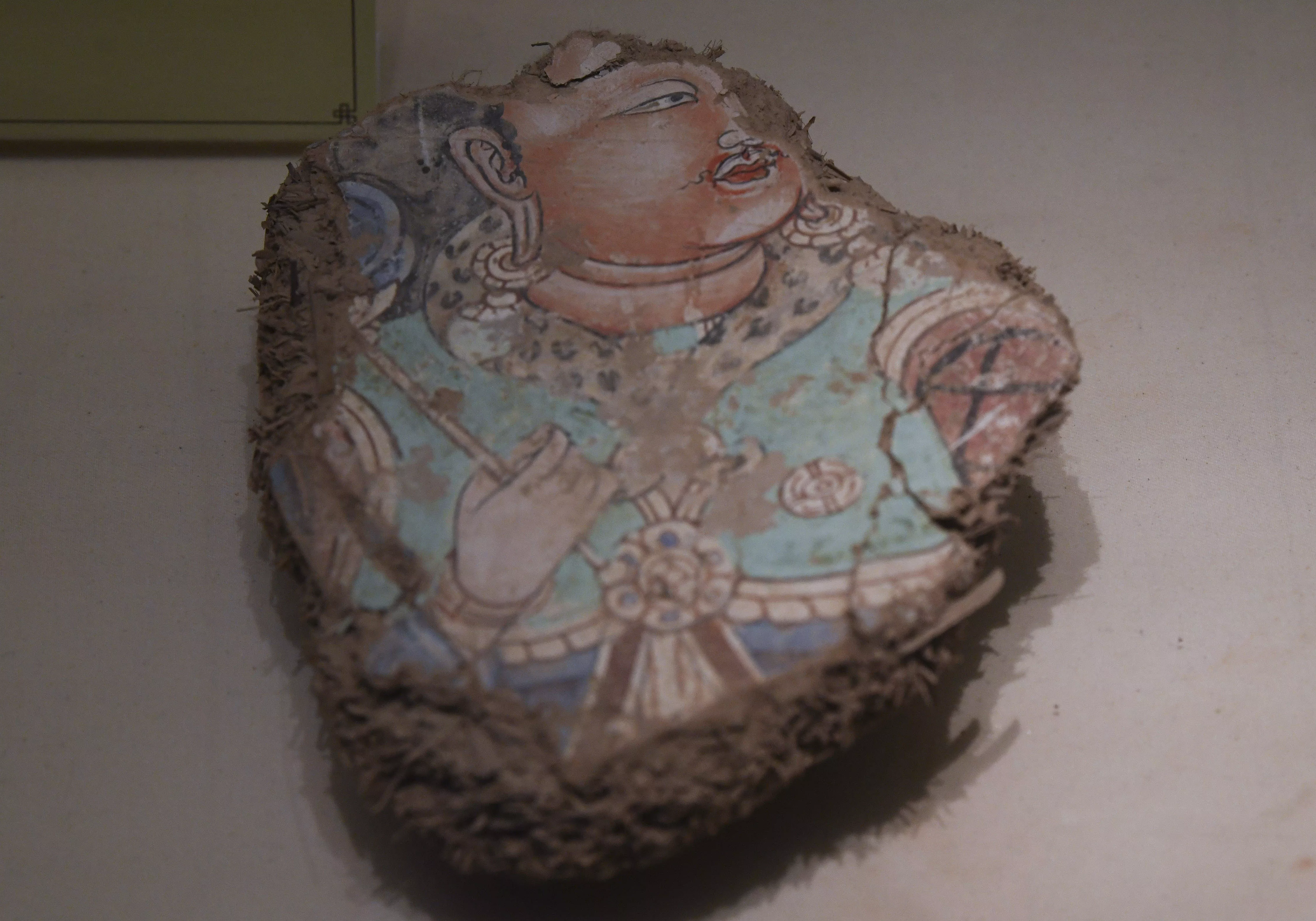 這是在位于圖木舒克市的新疆屯墾歷史博物館中展出的出土于唐代、位于圖木舒克市附近一處佛寺遺址內(nèi)的壁畫殘塊(4月28日攝)。