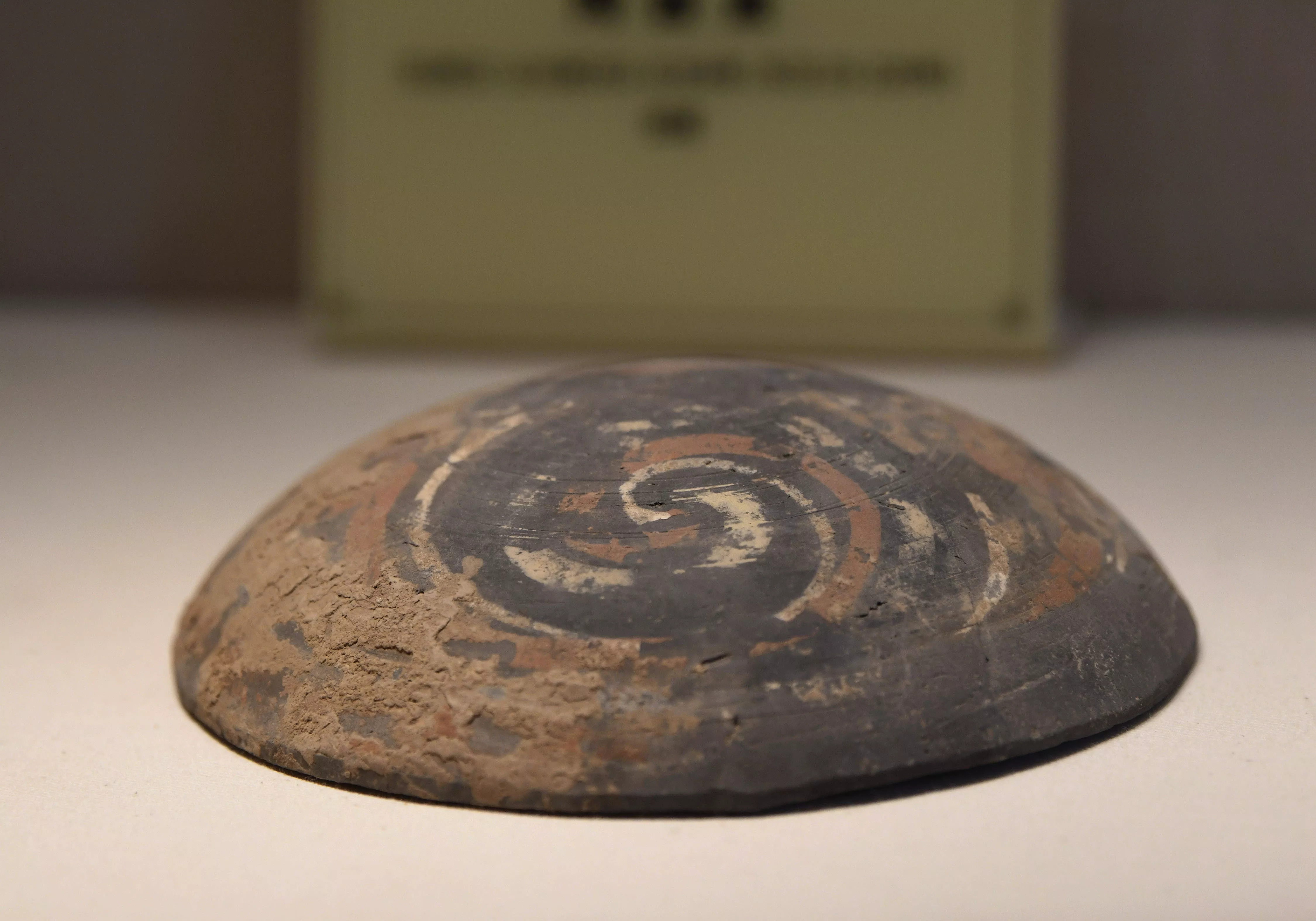 這是在位于圖木舒克市的新疆屯墾歷史博物館中展出的出土于漢代的唐王城遺址內(nèi)的陶器蓋(4月28日攝)。