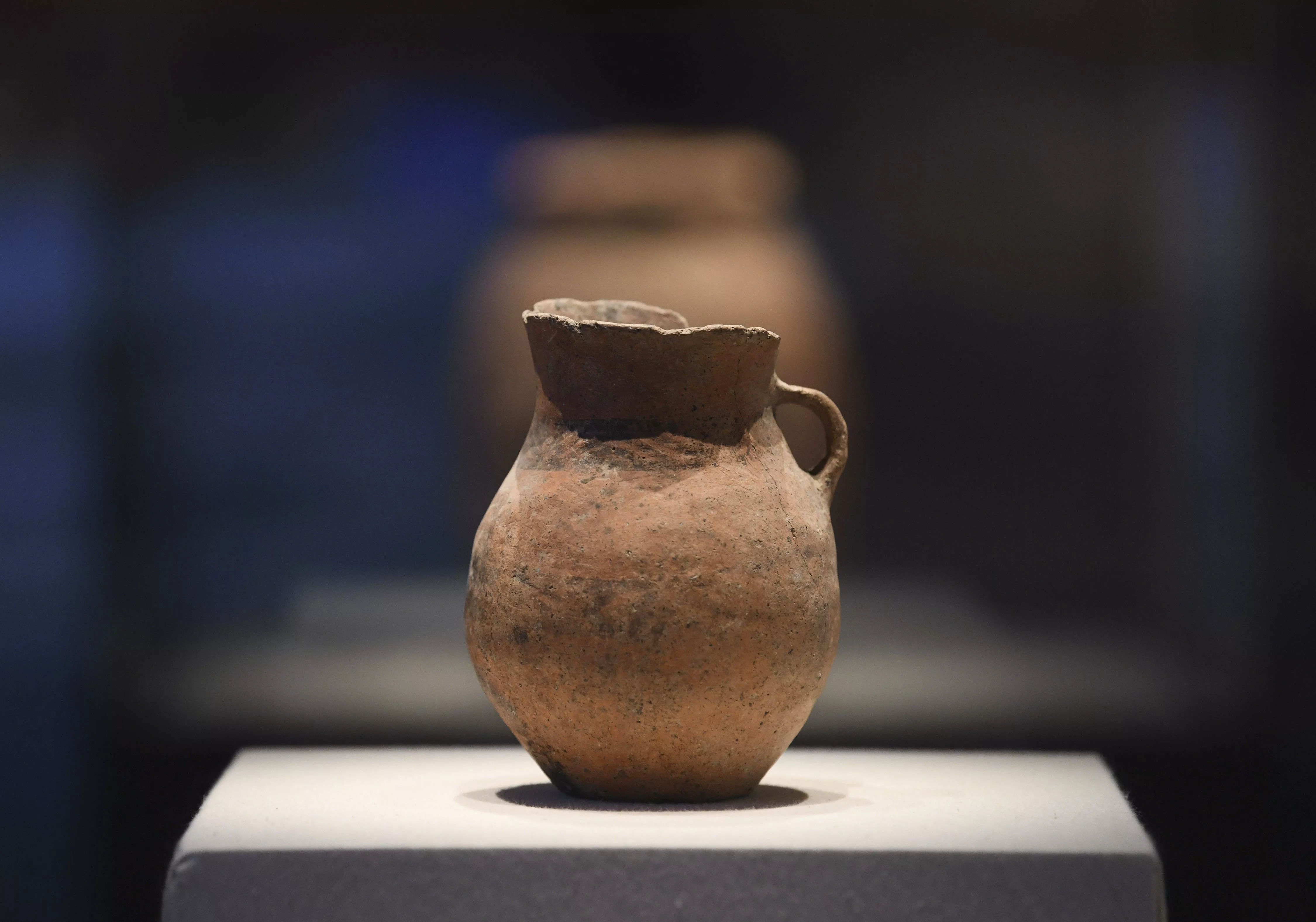 這是在位于圖木舒克市的新疆屯墾歷史博物館中展出的出土于漢代的唐王城遺址內(nèi)的單耳紅陶罐(4月28日攝)。