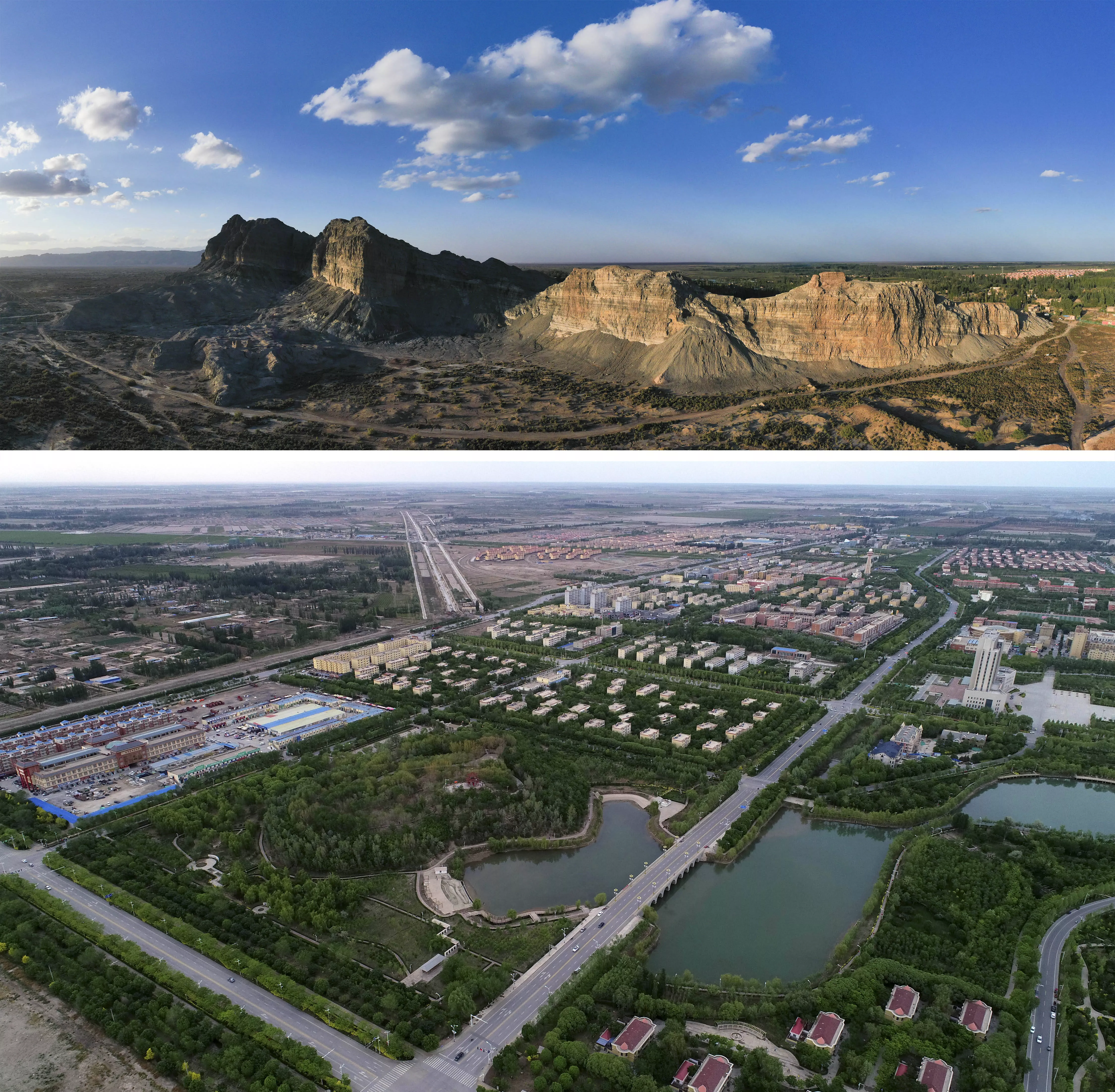 這是一張拼版照片:上圖是2020年9月20日拍攝的唐王城遺址(王俊龍 攝);下圖是2019年4月27日拍攝的圖木舒克市全景(崔顯朝 攝)。