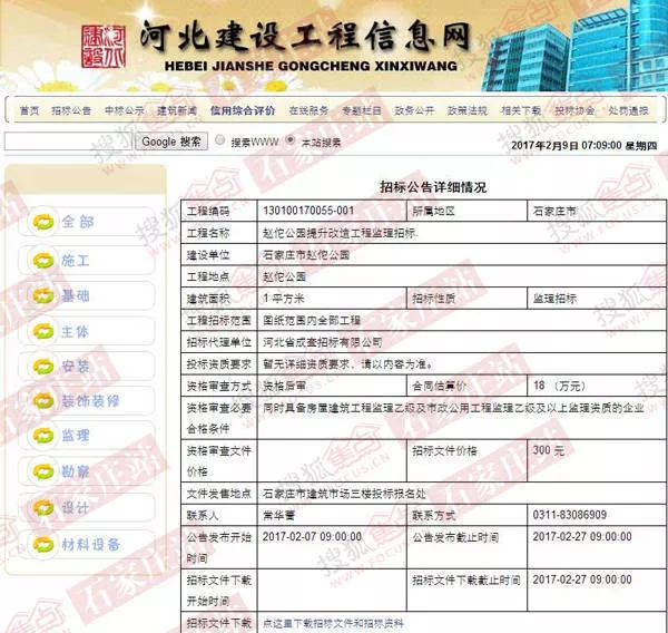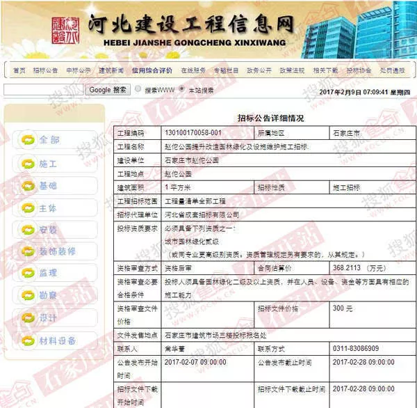 此外,招標信息中還顯示,石家莊市趙佗公園園林綠化及設施維護施工,計劃開工日期2017年3月10日,計劃竣工日期2017年6月9日。