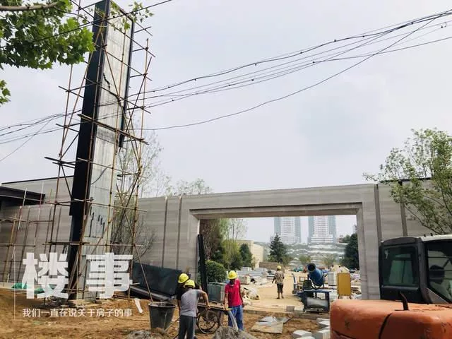 目前售樓處大門正在不斷完善中,施工支架可見。