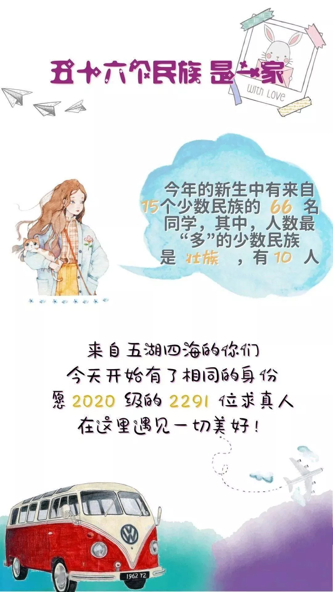 五十六個(gè)民族,五十六朵花。今年的新生中, 漢族2079人,少數(shù)民族69人,來(lái)自18個(gè)不同的民族。其中壯族人數(shù)最多,有13人。