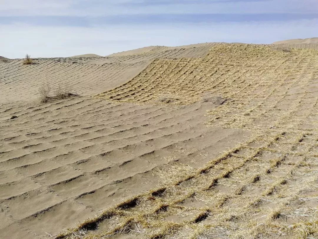沙丘上大面積鋪設的麥草方格