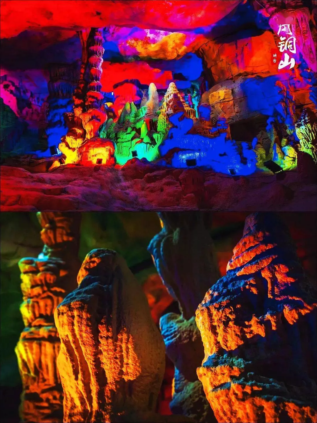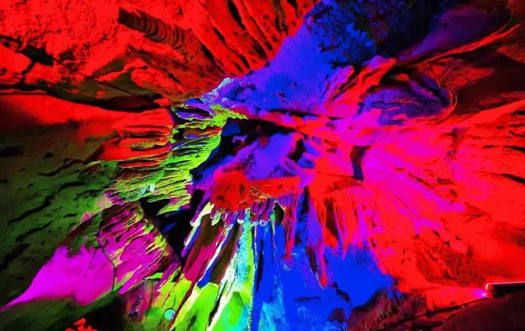 各種各樣的鐘乳石,石幔,石筍在彩色射燈的照射下,五光十色。像一張張畫卷,或真或假。耳畔的流水聲在溶洞回蕩,讓你內心無比寧靜。