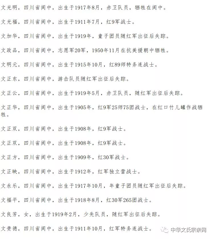 1932年12月18日,張國(guó)濤、徐向前等率領(lǐng)紅四方面軍16000人,經(jīng)陜西四川轉(zhuǎn)移,經(jīng)一個(gè)多月浴血奮戰(zhàn),紅四方面軍占領(lǐng)了通江、南江、巴中等縣。1933年成立了中共川陜省委和省蘇維埃政府,川陜根據(jù)地不斷壯大,毛澤東稱這里“是中華蘇維埃共和國(guó)的第二個(gè)大區(qū)域”。紅四方面軍建各級(jí)蘇維埃政權(quán),平分土地,反軍閥六路圍攻,擴(kuò)大紅軍,在川陜根據(jù)地廣袤的土地上,出了打土豪、分田地、參軍參戰(zhàn)、保家衛(wèi)田的群眾革命熱潮。而四川省是文姓居住較多的省份之一,許多文家兒女投身革命浪潮,參加各種革命組織,為反軍閥圍攻,保衛(wèi)和壯大紅色根據(jù)地以及長(zhǎng)征北上,很多先輩們獻(xiàn)出了自己寶貴的生命。今天從縣志、家譜、網(wǎng)絡(luò)等資料中整理出四川省文姓烈士名錄,約400多人,當(dāng)然,還有許多英烈的事跡仍需要我們?nèi)ネ诰蚺c整理。