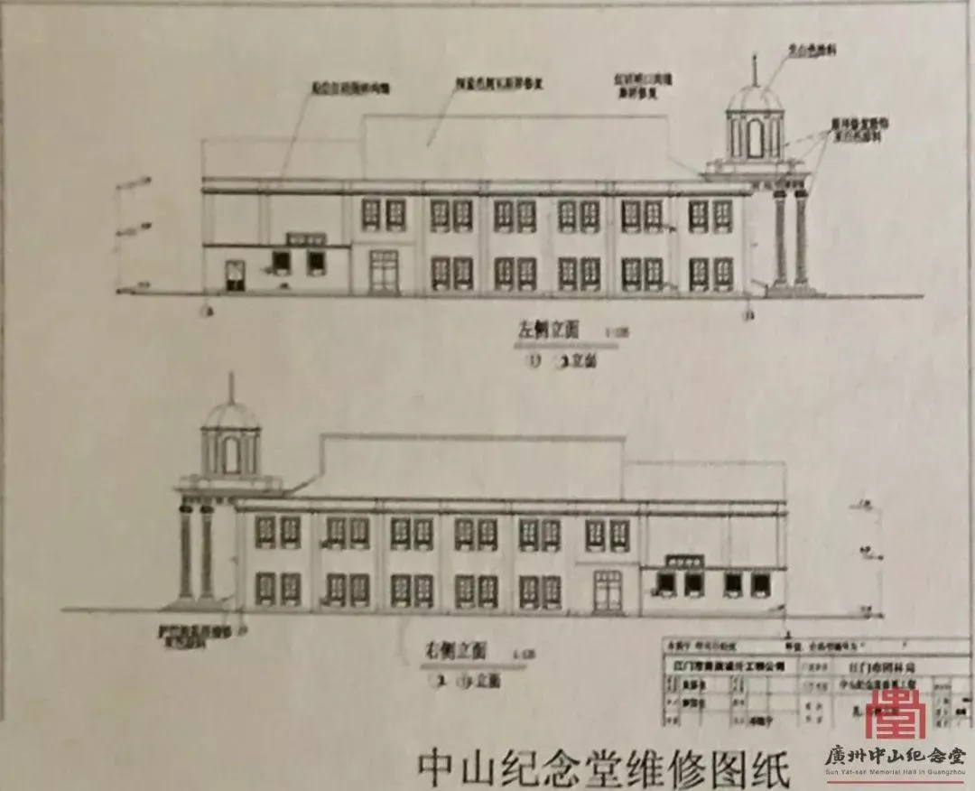 ▲2009年,江門(mén)市政府斥資450萬(wàn)元對(duì)中山紀(jì)念堂進(jìn)行全面維修,包括對(duì)局部外墻砼柱、墻基、柱基進(jìn)行了加固處理,并重修了二層走廊砼梁、板和瓦面,翻新了清水墻等,鋪設(shè)了地板磚,將土瓦更換成琉璃瓦,恢復(fù)彩色玻璃、天花板和水電線路等。圖為維修圖紙。