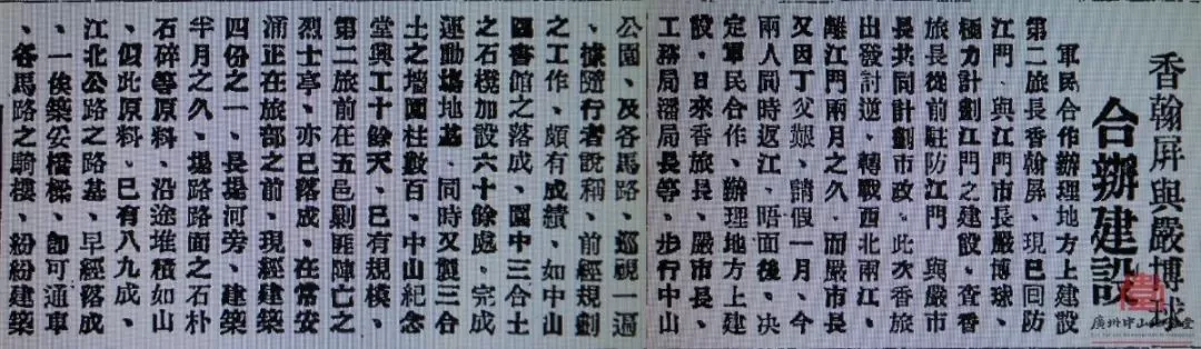 ▲1929年7月下旬,江門(mén)中山紀(jì)念堂開(kāi)工建設(shè)。8月,香翰屏、嚴(yán)博球曾視察中山紀(jì)念堂等市政建設(shè)。圖為《廣州民國(guó)日?qǐng)?bào)》1929年8月6日的報(bào)道。