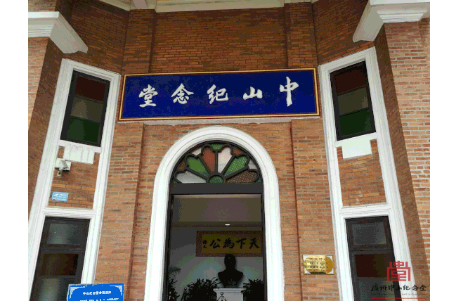 ▲大門(mén)口原掛有民國(guó)時(shí)期江門(mén)駐軍首長(zhǎng)香翰屏?xí)鴮?xiě)的“中山紀(jì)念堂”匾額,現(xiàn)匾額為江門(mén)書(shū)法家黃兆紀(jì)書(shū)寫(xiě)(1950年維修時(shí)替換)。