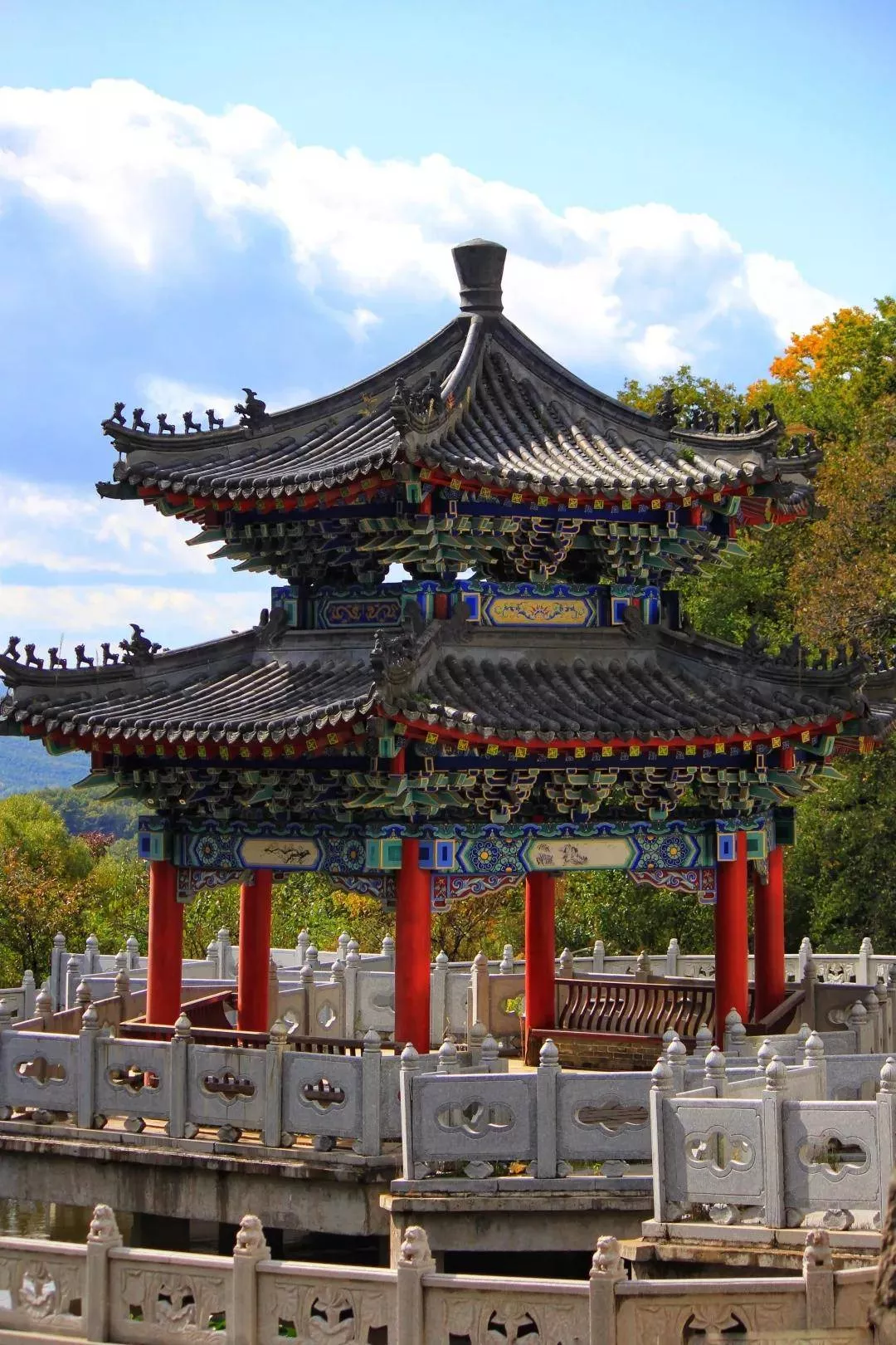 公園里建有諸多的亭、橋、廊、榭,點(diǎn)綴于林木蔥郁、景象幽深的山間,也難怪昔日“吉林八景”中,北山就以“北山雙塔”、“藥寺晚鐘”、“德碑夕照”三景而著稱。
