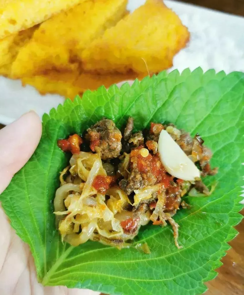 提前拌好入味的鮮肉放在碳盤上烤,滋啦滋啦的油脂聲勾人食欲??竞玫娜饩椭獍旰蜄|北酸菜一同被包裹進(jìn)蘇子葉里,葉的清新、肉的充盈、酸菜的脆爽一起在口里爆炸,吃肉就得這樣吃??!
