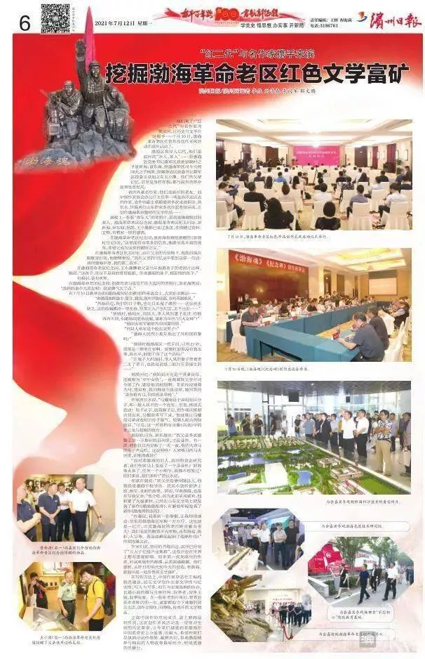 2021年7月12日濱州日?qǐng)?bào)專版。7月10日,渤海革命老區(qū)紅色作品創(chuàng)作采風(fēng)啟動(dòng)儀式舉行。他們來(lái)了!“紅二代”與名作家齊聚濱州,讓歷史與文學(xué)在這握手——7月10日,渤海革命老區(qū)紅色作品創(chuàng)作采風(fēng)活動(dòng)在濱州啟動(dòng)了。7月10日晚,《渤?;辍贰都o(jì)念碑》創(chuàng)作座談會(huì)舉辦。渤海區(qū)領(lǐng)導(dǎo)人后代,他們是濱州的“親人、家人”——原渤海區(qū)黨委書(shū)記兼軍區(qū)政委景曉村之子景新海、景東海,原渤海軍區(qū)司令